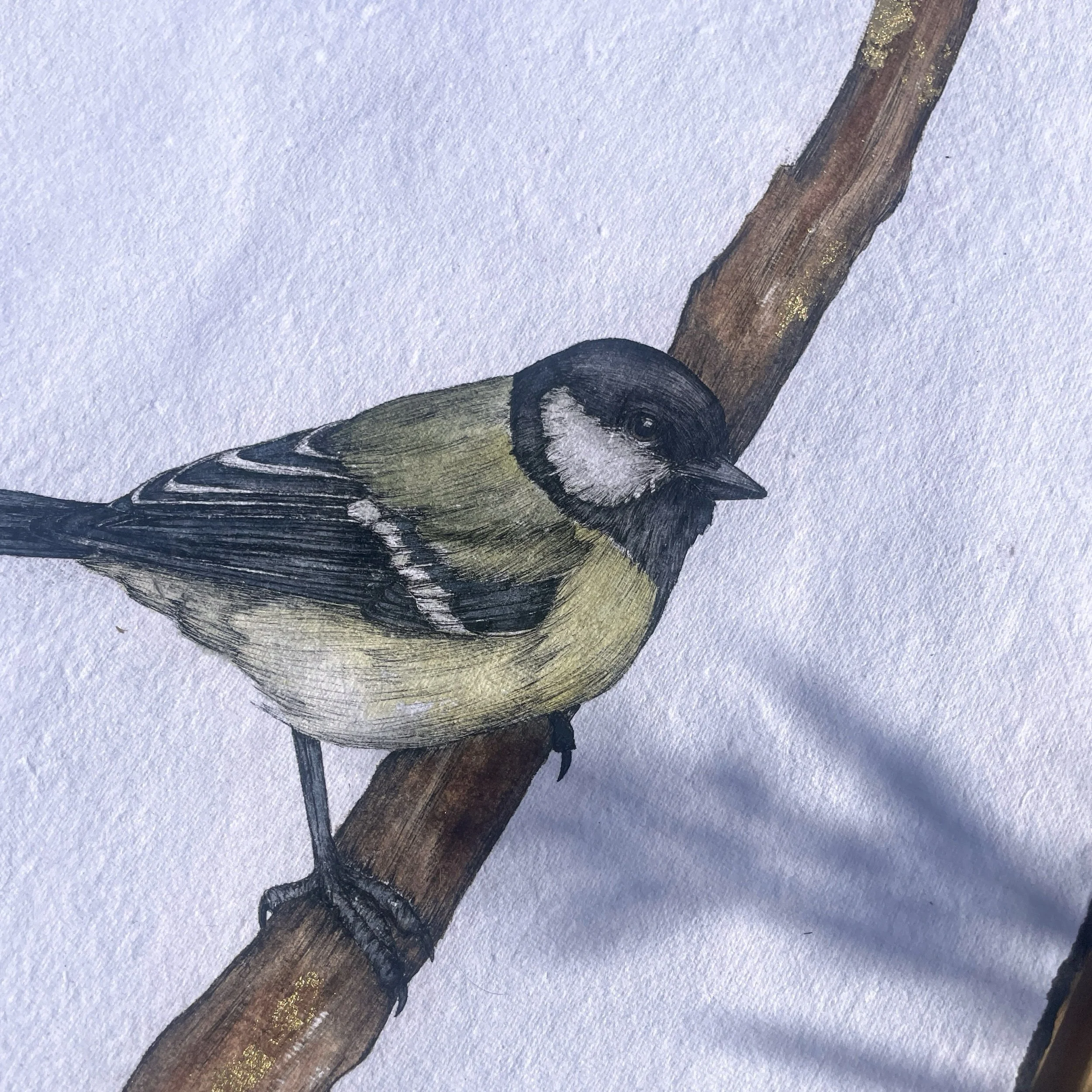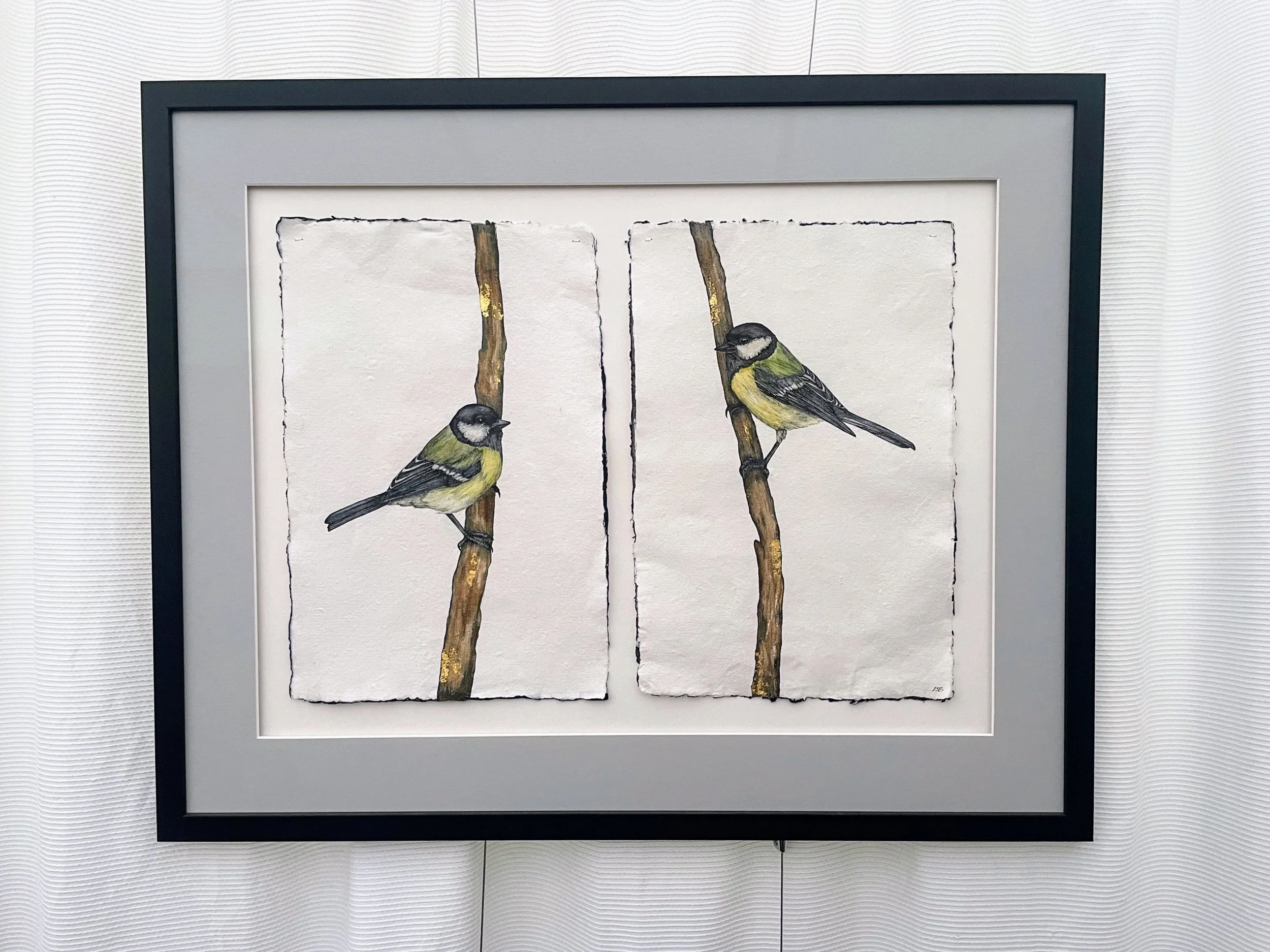 Pair of great tits, framed in a black frame with the paper stitched in place at the top.